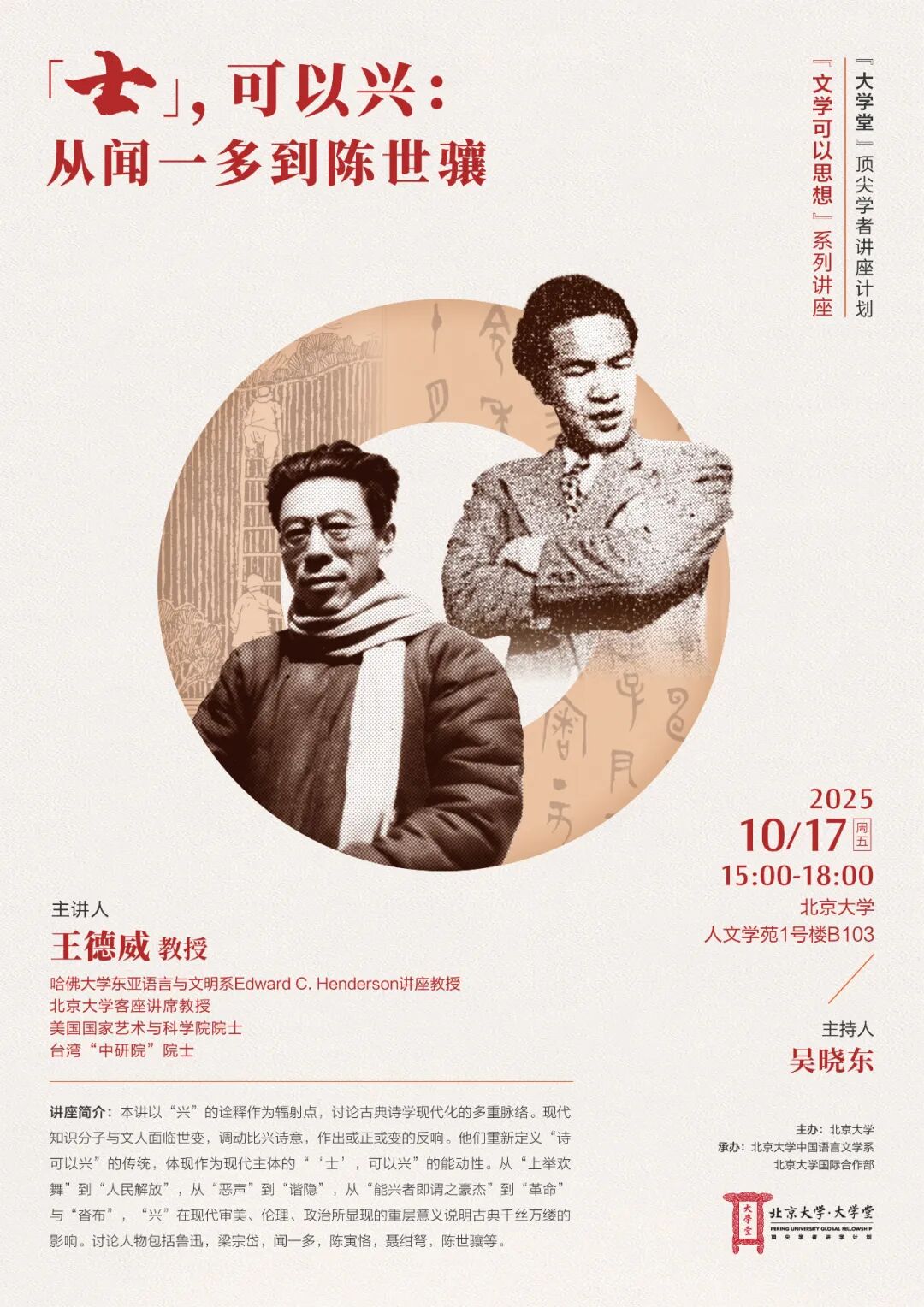 2025年10月17日下午,北京大学·大学堂顶尖学者讲学计划之“文学可以思想”王德威系列讲座第二讲在人文学苑1号楼B103会议室举行。主讲人哈佛大学东亚语言与文明系 Edward C.Henderson 讲座教授、北京大学客座讲席教授、美国国家艺术与科学院院士、台湾“中研院”院士王德威作了题为“‘士,可以兴’:从闻一多到陈世骧”的讲座。“文学可以思想”系列讲座由北京大学主办,北京大学中国语言文学系、北京大学国际合作部承办。第二次讲座由北京大学中文系博雅特聘教授吴晓东主持。